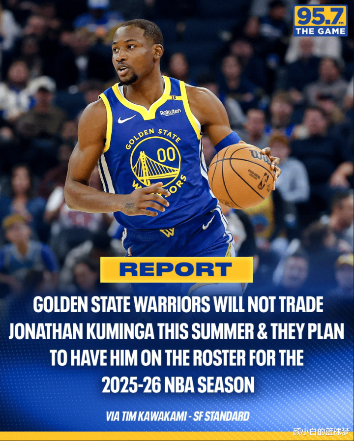北京时间8月5日,勇士记者Tim Kawakami报道,勇士今夏不会交易走乔纳森-库明加,并计划将他继续留在下赛季的阵容当中。勇士队老板乔-拉科布依旧很欣赏库明加决心留住他,只有在能够换回真正具有价值的资产时才会考虑送走他。